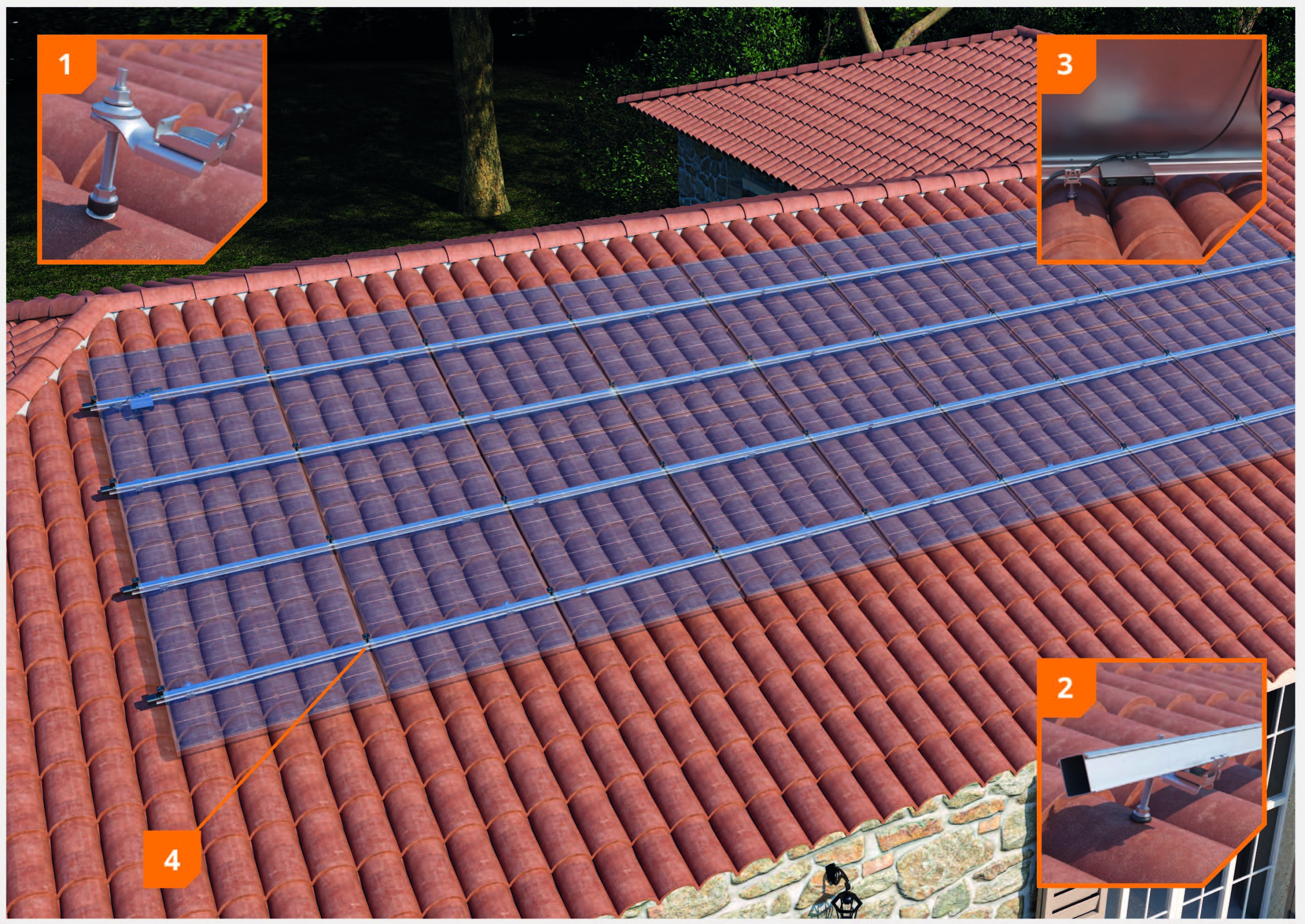 Le crochet ClickFit EVO pour toits en tuile canal a été spécialement développé pour la pose du système ClickFit EVO sur les toits en tuile canal. Ce système simple à quatre composants est parfaitement adapté aux toitures neuves comme anciennes. La vis double filetage préassemblée est dotée du clicker ClickFit EVO. Ce système universel exclusif permet une pose facile et rapide et facile des panneaux solaires sur les toits en pente. Le système de montage ClickFit EVO pour les toits en pente se compose de seulement 4 éléments de base. Cela rend l'installation très facile.