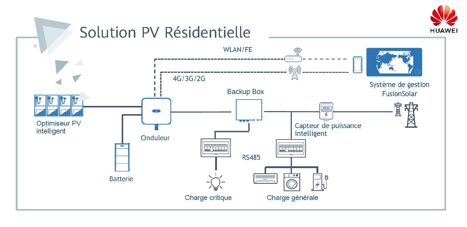 Il se connecte en RS485 (Modbus-RTU) aux onduleurs Huawei, optimise l’autoconsommation et le pilotage énergétique.
